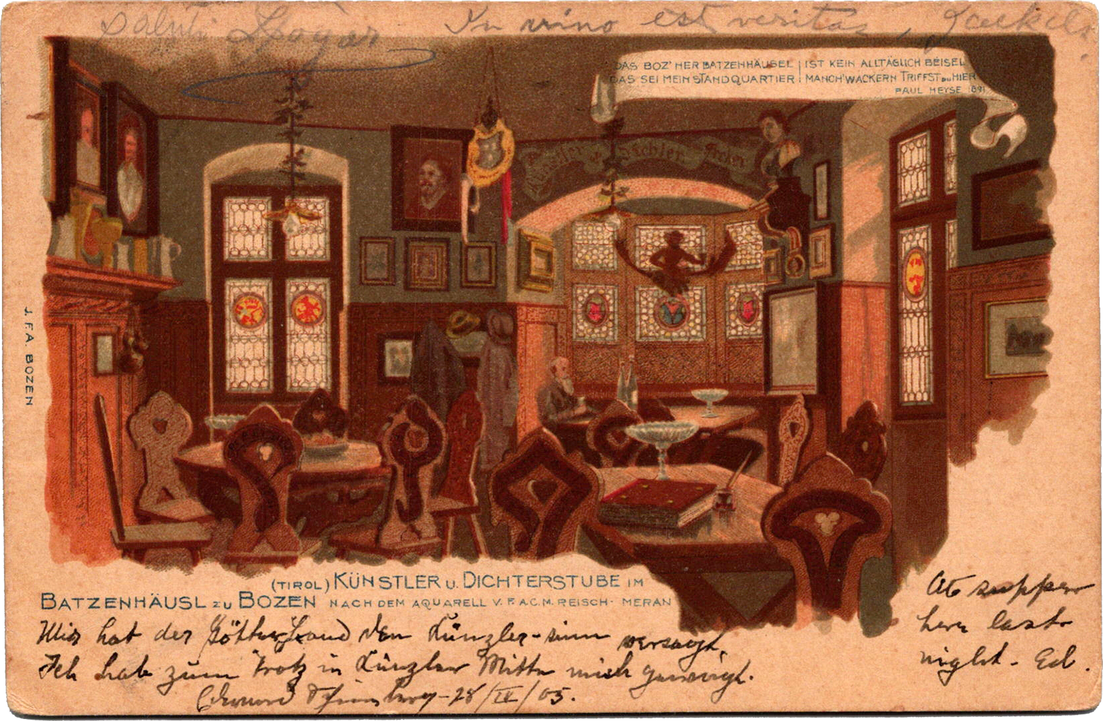 Künstler u. Dichterstube Im Batzenhäusl zu Bozen (Tirol), Italy Künstler u. Dichterstube Im Batzenhäusl zu Bozen (Tirol) Dated: Apr 28 1905 From: Edward Schimberg, Luigi “Gigi” Fogar, Martin “D.D.” “Dee” Jaekels To: Albert P. Schimberg Referenced: Paul Heyse Location: Bolzano, Tyrol, Italy Publisher: Joh. Filibert Amonn