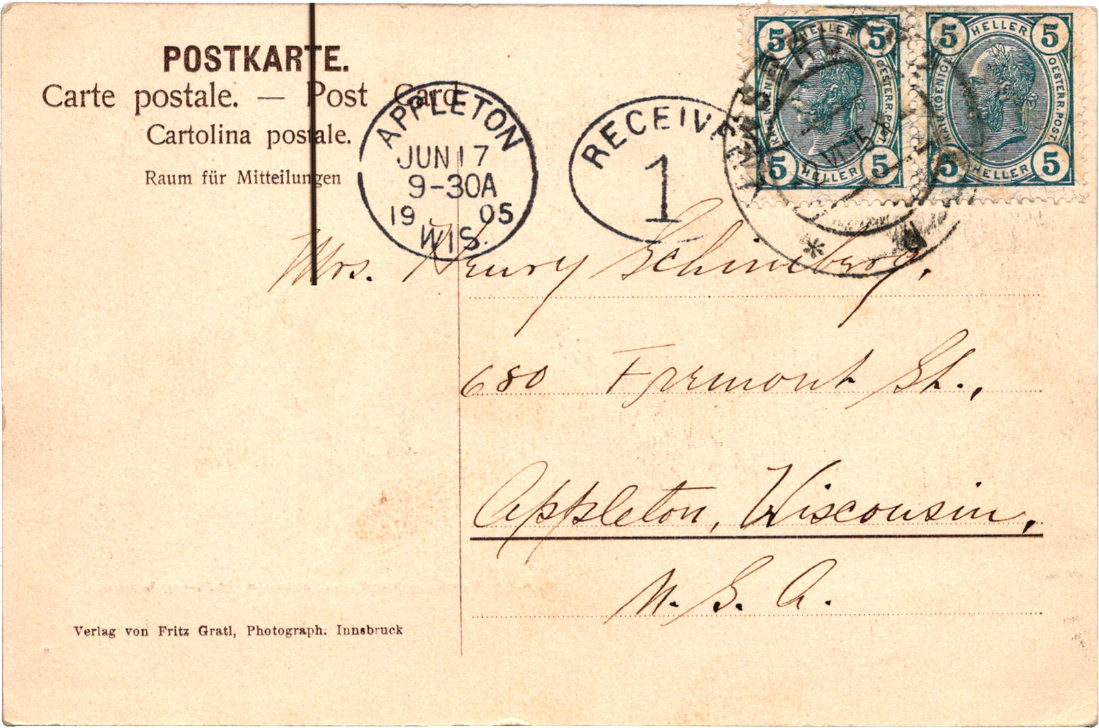 Wildbad, Volderthal, Austria Wildbad,Volderthal Dated: Jun 13 1905 From: Edward Schimberg, Martin “D.D.” “Dee” Jaekels, Hubert M. Ostermann, Peter Winkelmann To: Anna Schimberg Location: Volders, Tyrol, Austria Publisher: Lina Zobl