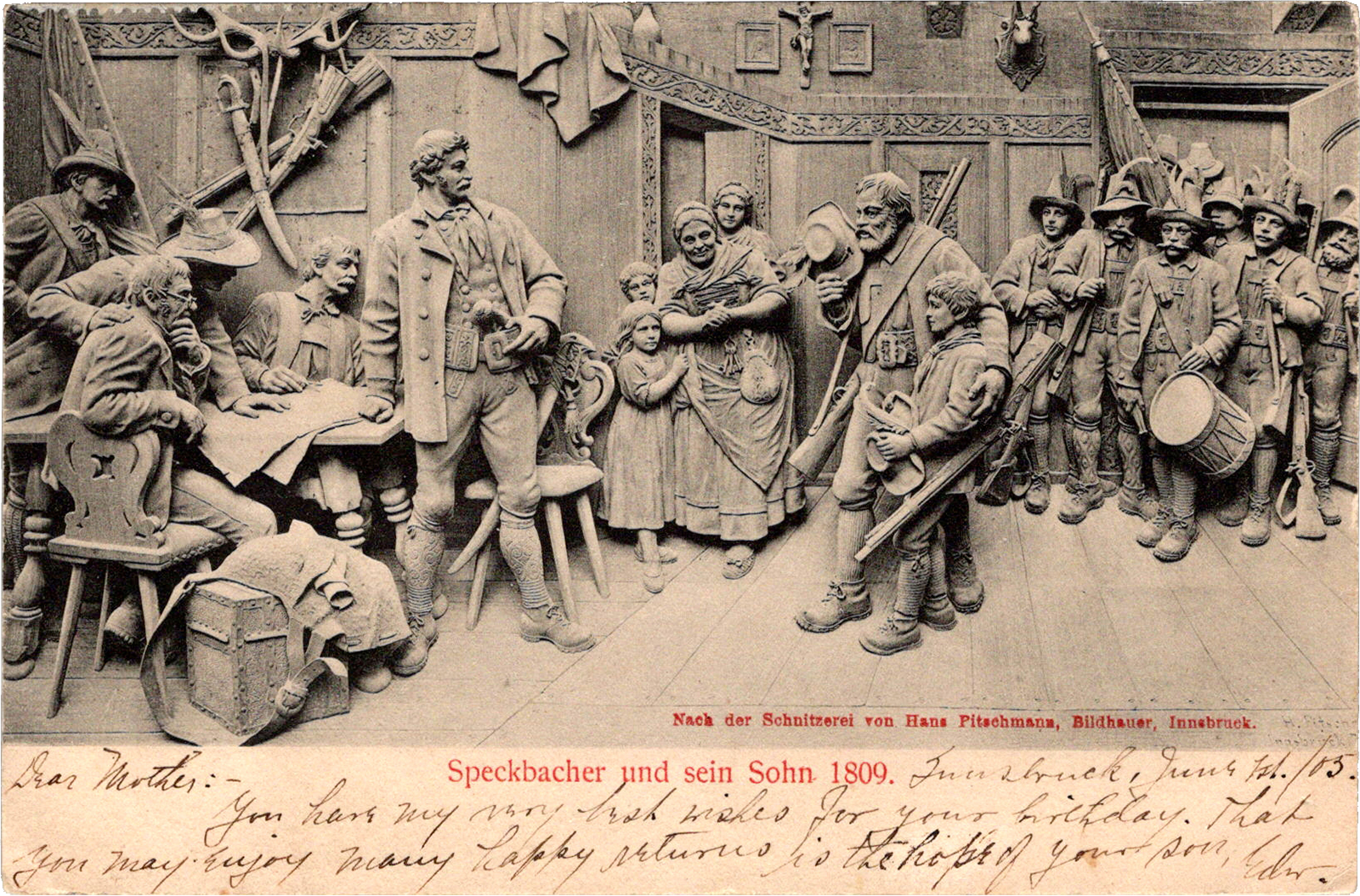 Speckbacher und sein Sohn 1809, Nach der Schnitzerei von Hans Pitschmann, Bildhauer, Innsbruck, Austria Speckbacher und sein Sohn 1809 Dated: Jun 1 1905 From: Edward Schimberg To: Josephine Frantz Schimberg Location: Innsbruck, Tyrol, Austria Publisher: Fritz Gratl