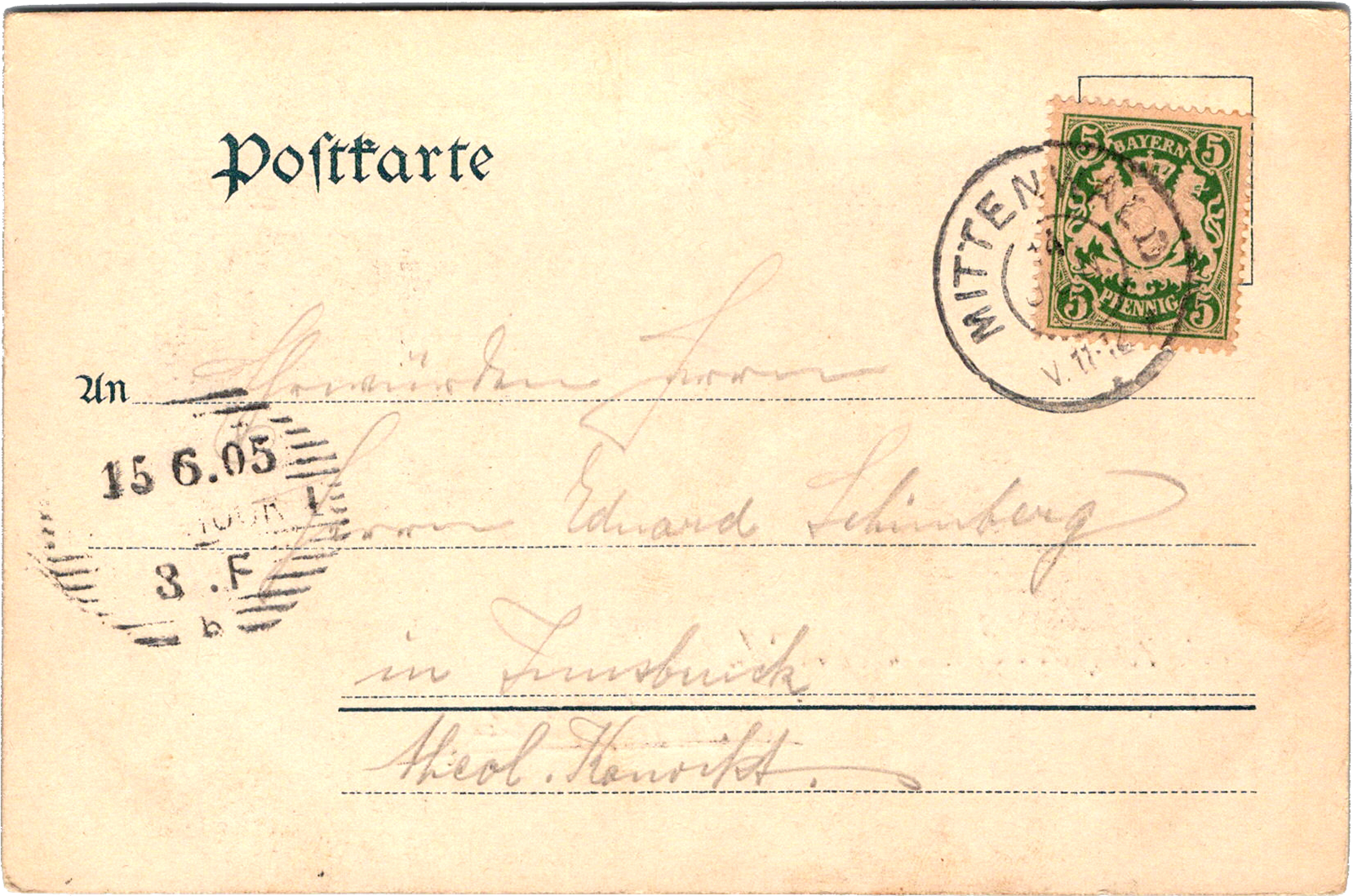 Leutaschklamm mit Wasserfall, Mittenwald gg. Tirol, Austria Mittenwald gg. Tirol Postmarked: Jul 15 1905 From: Pichlen To: Edward Schimberg Location: Mittenwald, Bavaria, Germany Publisher: Louis Glaser