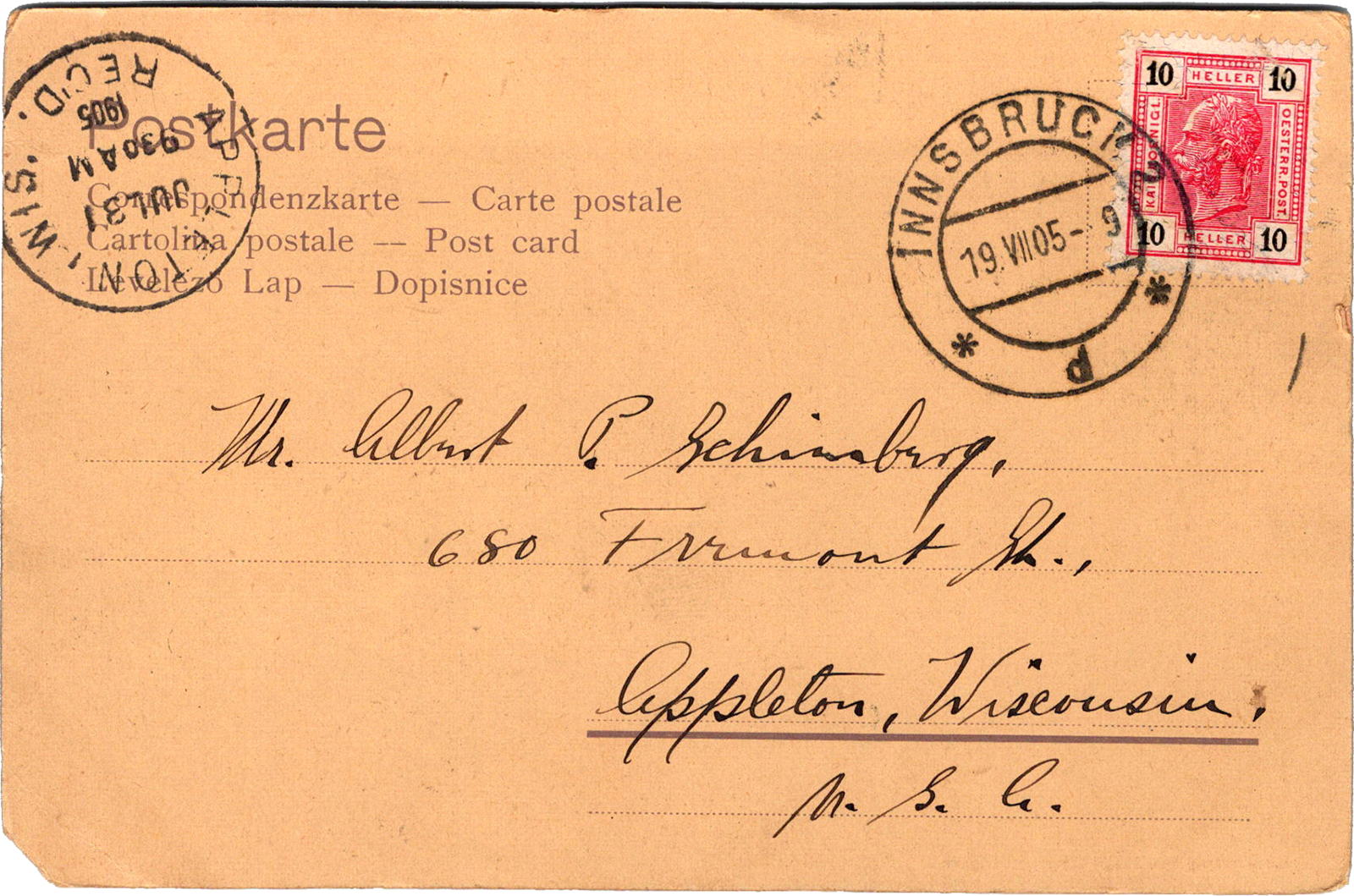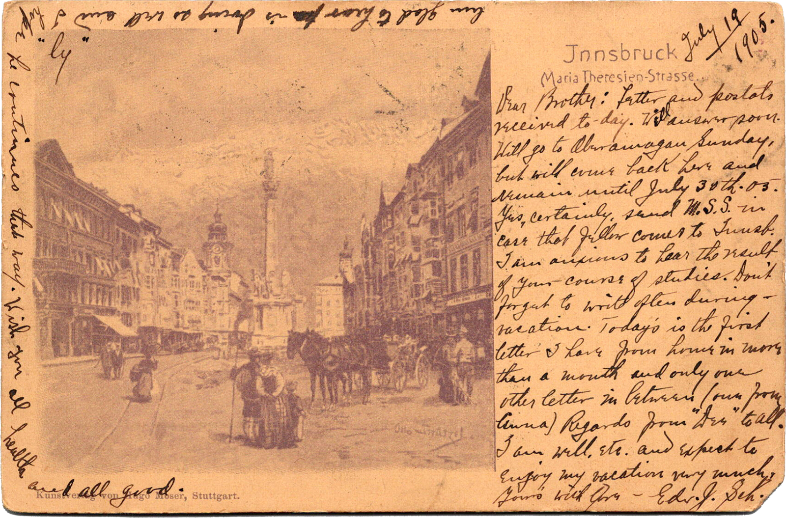 Maria-Theresien-Strasse, Innsbruck, Austria Innsbruck: Maria-Theresien-Strasse Dated: Jul 19 1905 From: Edward Schimberg To: Albert P. Schimberg Referenced: Martin “D.D.” “Dee” Jaekels, Henry S. Schimberg, Anna Schimberg Location: Innsbruck, Tyrol, Austria Publisher: Hugo Moser