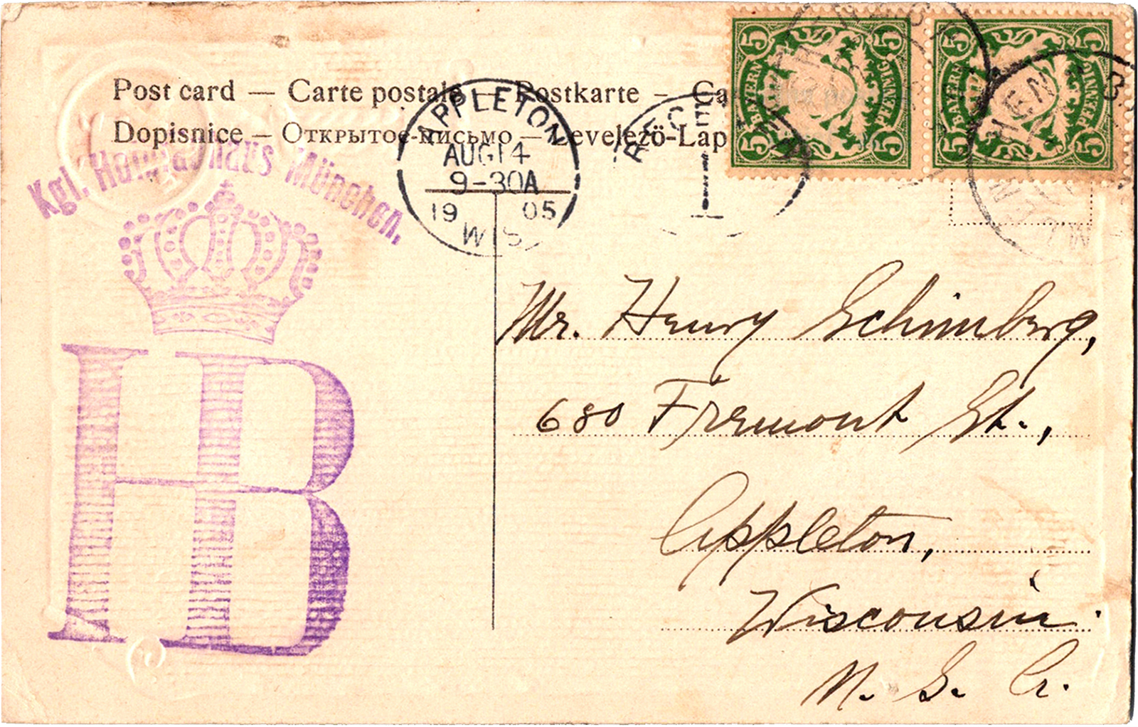 San d’Massl alle leer, Na nimm i d’Fassl her, Gruss Aus München Gruss Aus München Dated: Aug 2 1905 From: Edward Schimberg To: Albert P. Schimberg Location: Munich, Bavaria, Germany