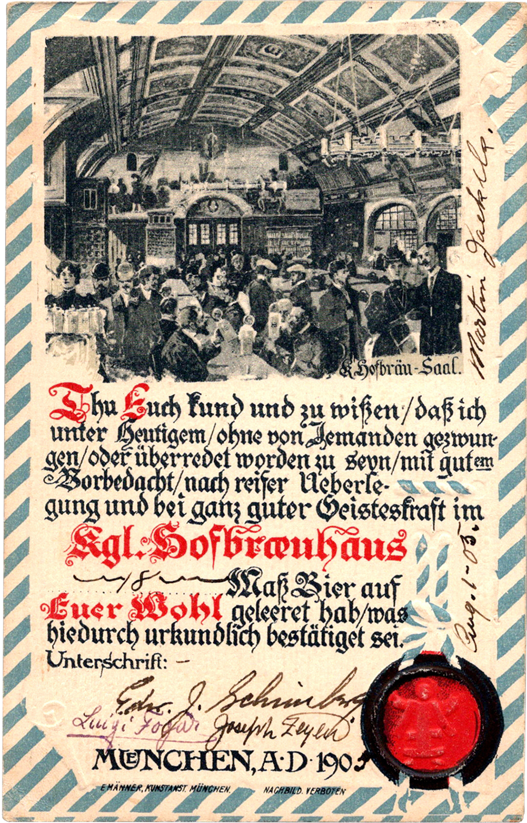 Kgl. Hofbrauhaus, Munich, Germany Hofbräu-Saal Dated: Aug 1 1905 From: Edward Schimberg, Luigi “Gigi” Fogar, Joseph “Stumpy” Zeyen, Martin “D.D.” “Dee” Jaekels To: Henry S. Schimberg Location: Munich, Bavaria, Germany Publisher: E. Männer Kunstanstalt