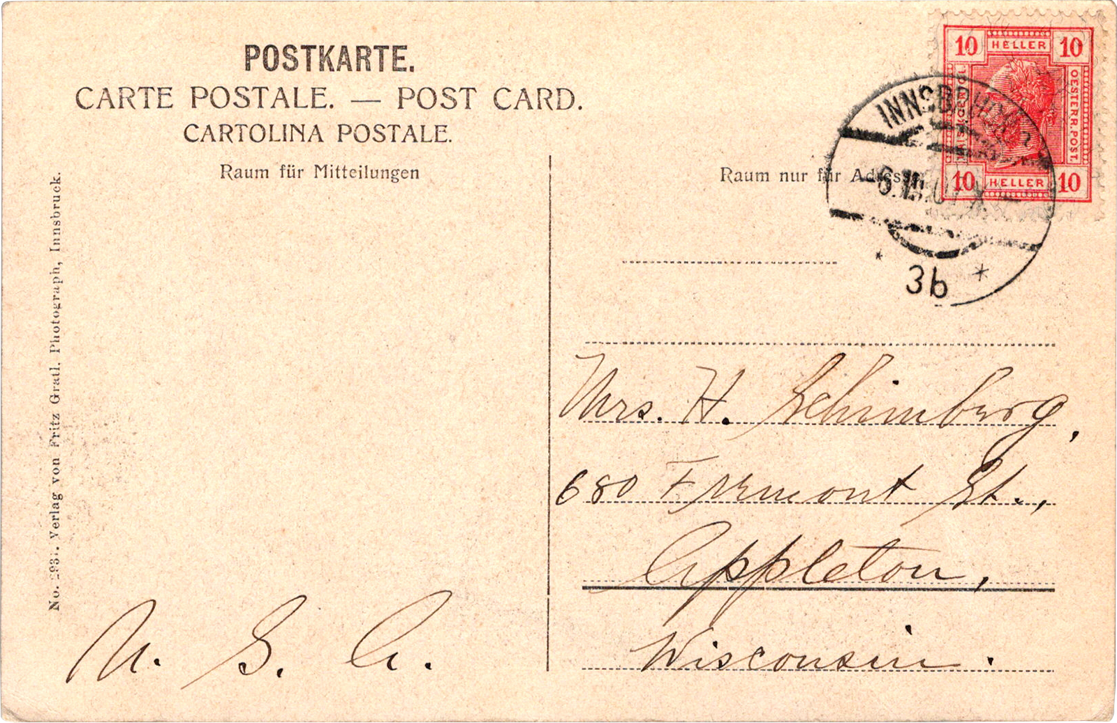 Schloss Amras bei Innsbruck, Austria Schloss Amras bei Innsbruck. Dated: Mar 16 1907 From: Hubert M. Ostermann To: Edward Schimberg Referenced: Rev. A. Garthaus, Rev. Kommers, Joseph “Stumpy” Zeyen, Rex, Jack, Cyril Haffner Location: Innsbruck, Tyrol, Austria Publisher: Fritz Gratl