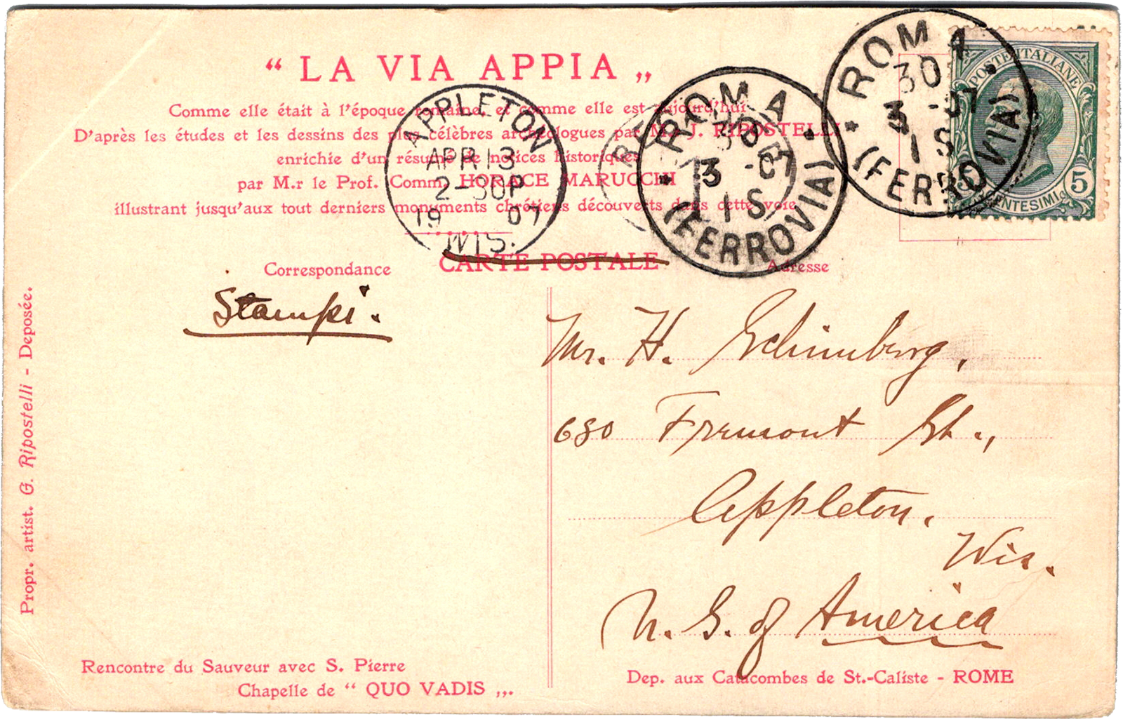 Rencontre du Sauveur avec S. Pierre, Chapelle de “Quo Vadis”, Rome, Italy Rencontre du Sauveur avec S. Pierre, Chapelle de “Quo Vadis” Dated: Mar 29 1907 From: Edward Schimberg To: Henry S. Schimberg Location: Rome, Roma, Italy Publishers: Dep. aux Catacombes de St. Caliste G. Ripostelli