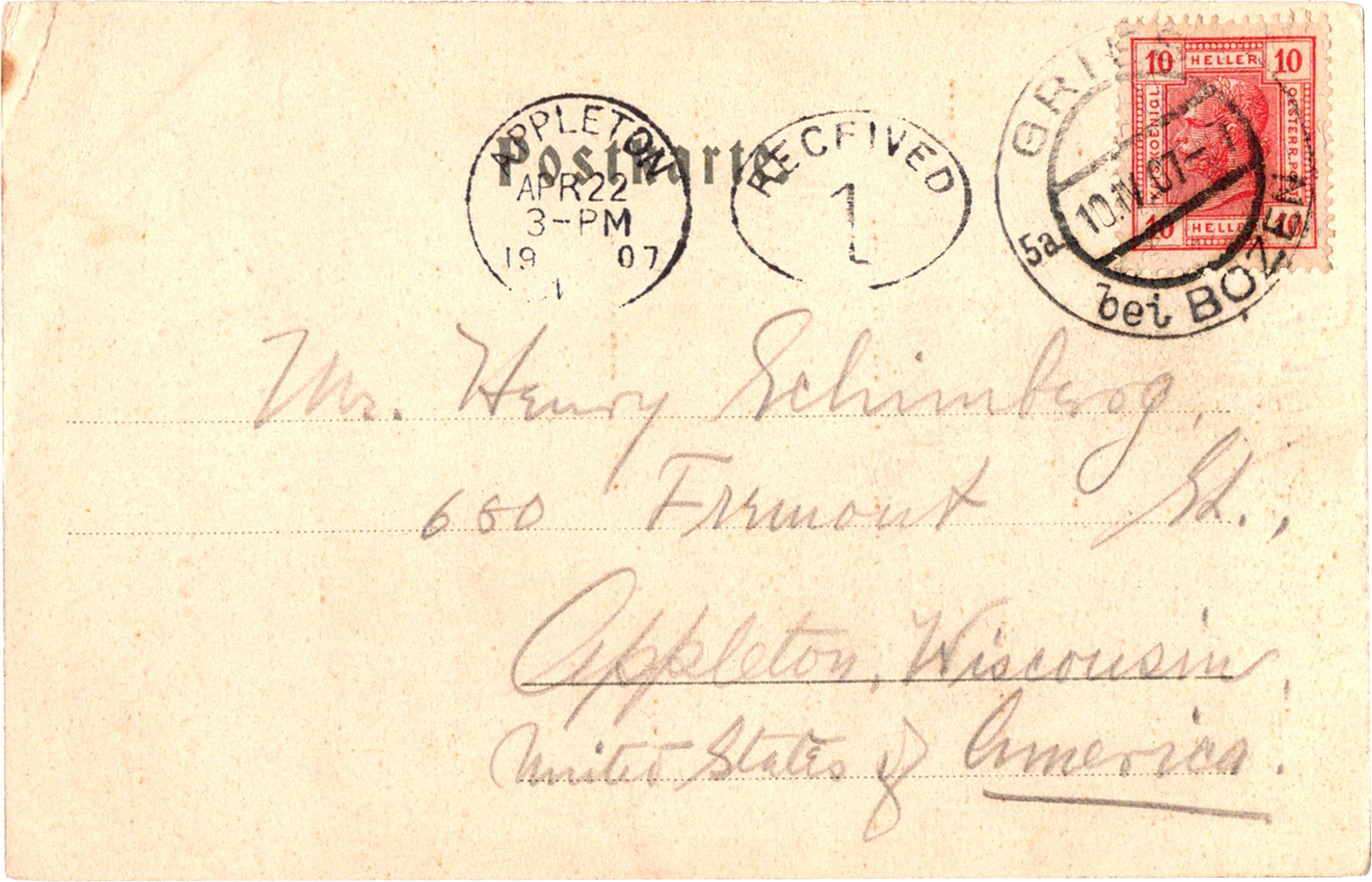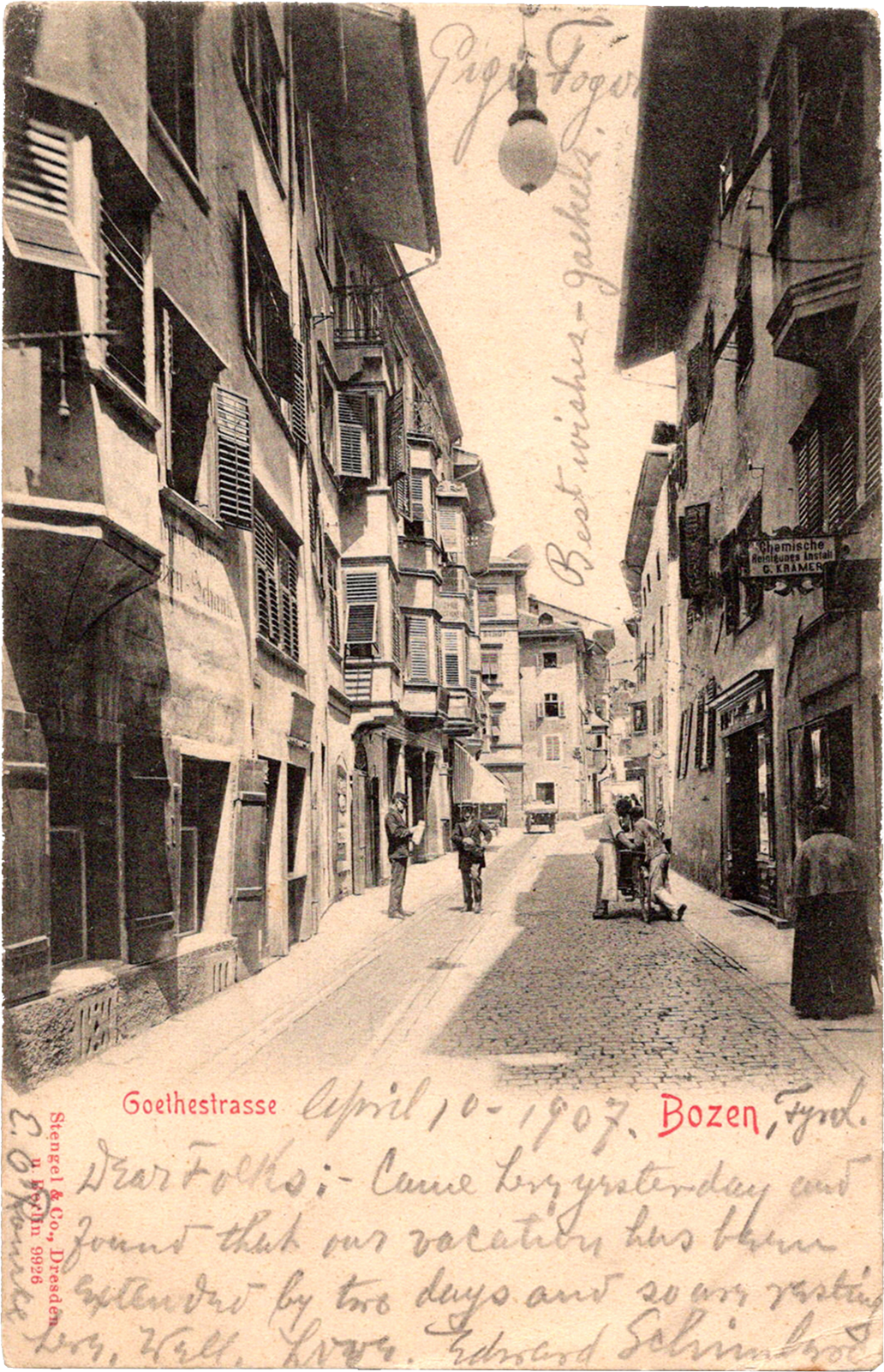 Goethestrasse, Bozen, Tyrol, Italy Goethestrasse Bozen Dated: Apr 10 1907 From: Edward Schimberg, Edward O’Rourke, Martin “D.D.” “Dee” Jaekels, Luigi “Gigi” Fogar To: Henry S. Schimberg, Josephine Frantz Schimberg Location: Bolzano, Tyrol, Italy Publisher: Stengel & Co