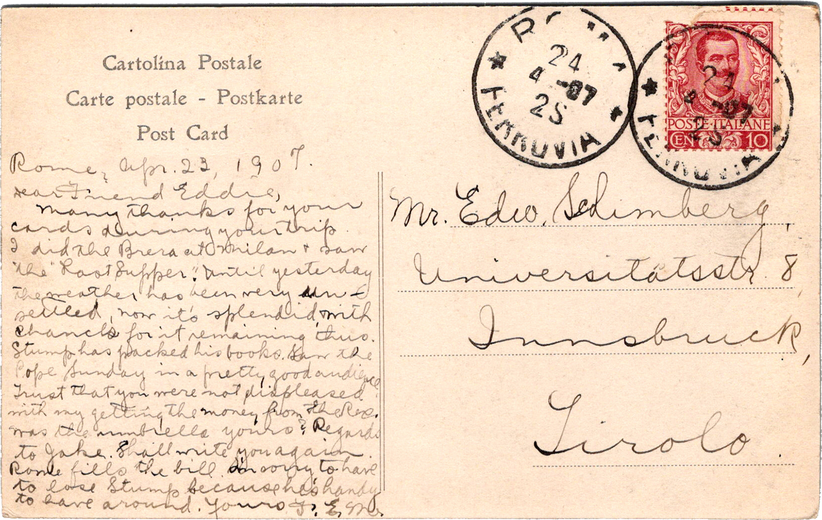 Piazza del Popolo, Roma, Italy Roma – Piazza del Popolo Dated: Apr 23 1907 From: Fr. E. Murphy To: Edward Schimberg Referenced: Joseph “Stumpy” Zeyen, Martin “D.D.” “Dee” Jaekels Location: Rome, Roma, Italy