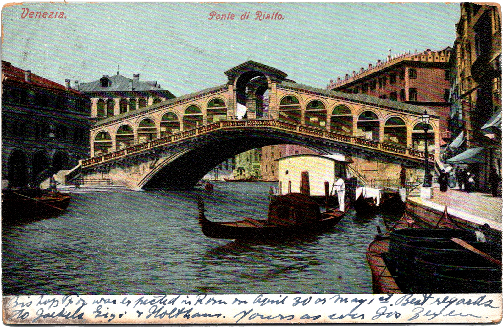 Ponte di Rialto, Venezia, Italy Venezia. Ponte di Rialto. Dated: May 1 1907 From: Joseph “Stumpy” Zeyen To: Edward Schimberg Referenced: Rev. Fr. Piscins, Bishop Joseph John Fox, Martin “D.D.” “Dee” Jaekels, Luigi “Gigi” Fogar, Holthaus Location: Venice, Venezia, Italy