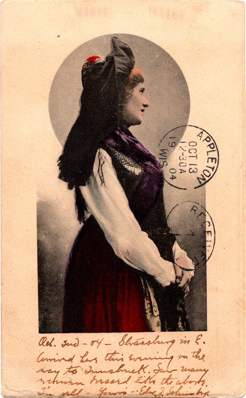 Arrived here this evening on the way to Innsbruck. Saw many women dressed like the above. I'm well. Yours - Edw. J. Schimberg
