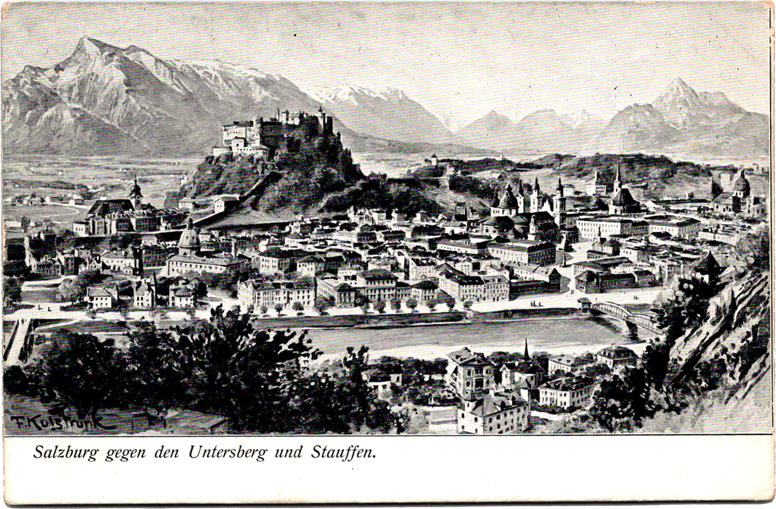 Salzburg gegen den Untersberg und Stauffen, Austria Salzburg gegen den Untersberg und Stauffen Artist: Kulstrunk, Franz Estimated Date: Jul 30 1906 Location: Salzburg, Land Salzburg, Austria Publisher: J. Huttegger