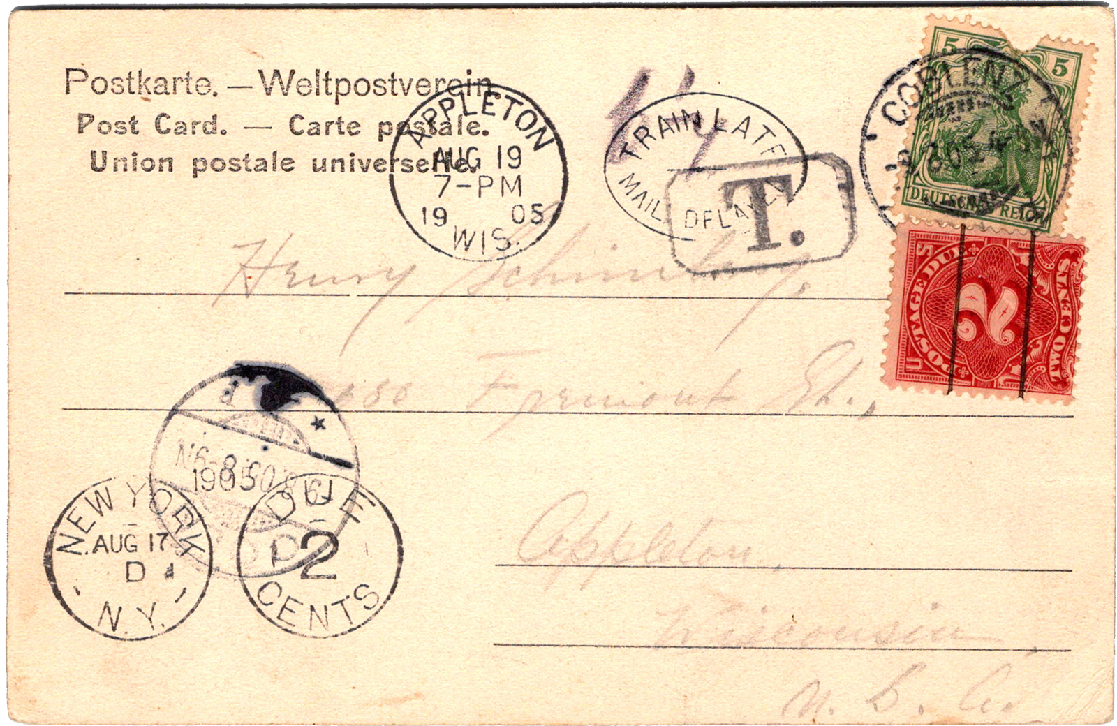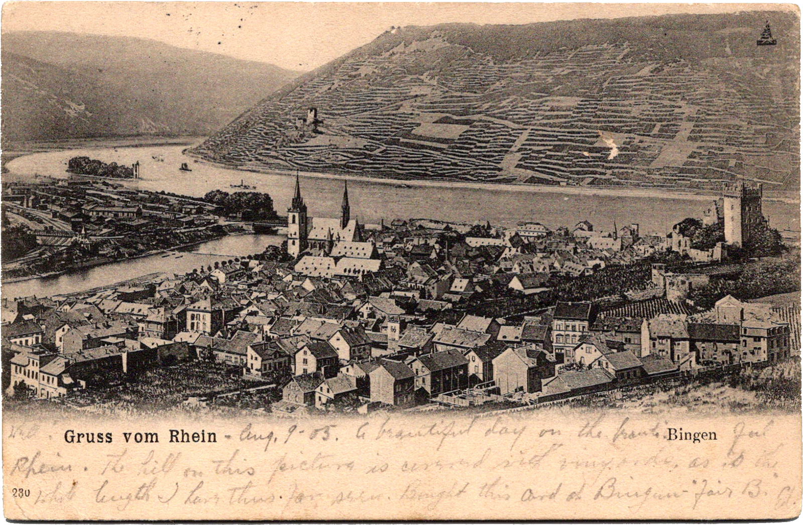 Aug. 9-05. A beautiful day on the beautiful Rhein. The hill on this picture is covered with vineyards, as is the whole length I have thus far seen. Bought this card at Bingen - fair B. Ed.