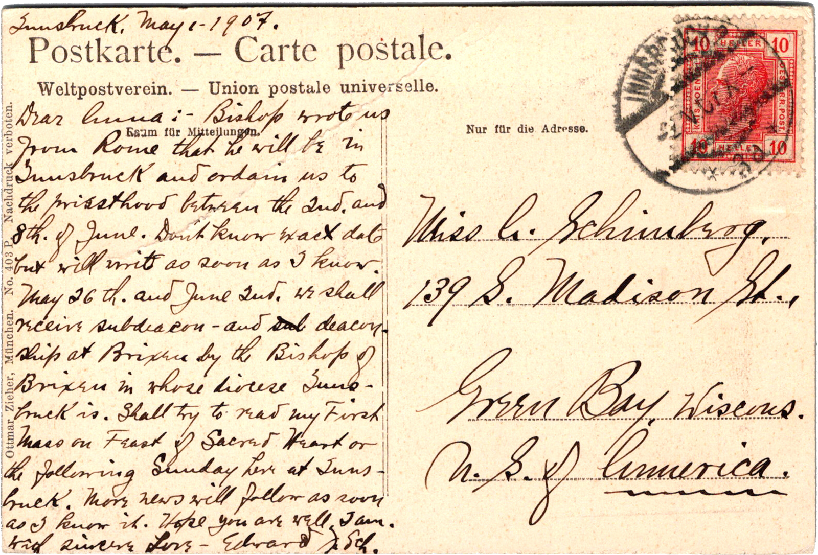Hötting, Austria Hötting Dated: May 1 1907 From: Edward Schimberg To: Anna Schimberg Referenced: Bishop Joseph John Fox Publisher: Ottmar Zieher