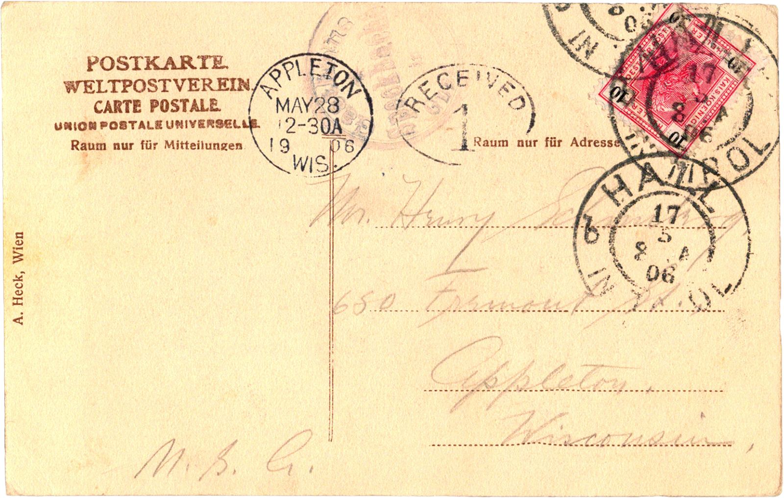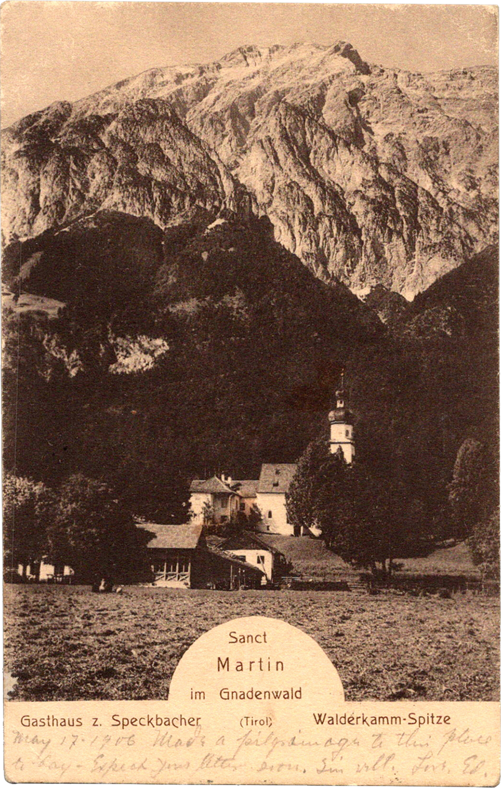 Gasthaus z. Speckbacher, Walderkamm-Spitze, Sanct Martin im Gnadenwald, Austria Sanct Martin im Gnadenwald: Gasthaus z. Speckbacher, Walderkamm-Spitze Dated: May 17 1906 From: Edward Schimberg To: Henry S. Schimberg Publisher: A. Heck