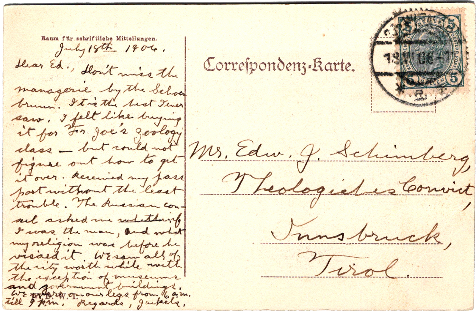 Blick Vom Gloriett, Wien-Schönbrunn, Austria Wien-Schönbrunn. Blick Vom Gloriett. Dated: Jul 18 1906 From: Martin “D.D.” “Dee” Jaekels To: Edward Schimberg Referenced: Fr. Joe, Mr. Nowakowski, Fr. E. Murphy, Dan Hyland, Gilly
