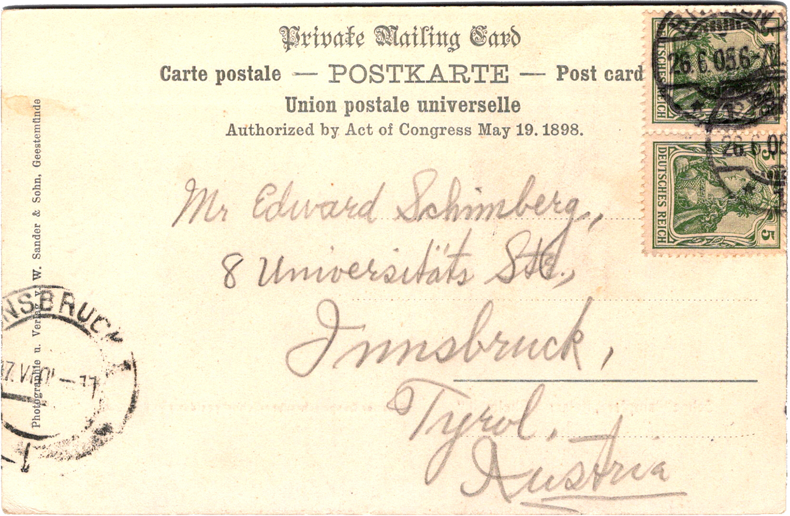 Schnelldampfer Kaiser Wilhelm II, Norddeutscher Lloyd, Bremen, Germany Schnelldampfer Kaiser Wilhelm II: Nordd. Lloyd, Bremen Dated: May 29 1906 From: Sebastian G. Messmer To: Anna Schimberg Publisher: W. Sander & Sohn