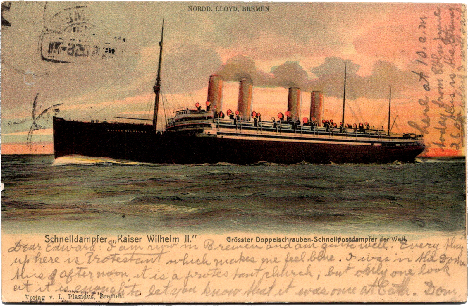 Schnelldampfer Kaiser Wilhelm II, Grösster Doppelschrauben-Schnellpostdampfer der Welt, Norddeutscher Lloyd, Bremen, Germany Schnelldampfer “Kaiser Wilhelm II” Postmarked: Jun 26 1905 From: John J. Stenglein To: Edward Schimberg Publishers: L. Plazidus W. Sander & Sohn