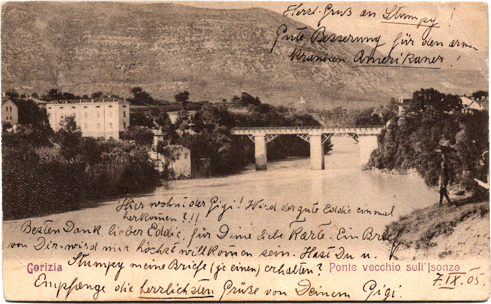 Ponte vecchio sull’Isonzo, Gorizia, Italy Gorizia: Ponte vecchio sull’Isonzo Dated: Sep 7 1905 From: Luigi “Gigi” Fogar To: Edward Schimberg Referenced: Joseph “Stumpy” Zeyen Publisher: Saul D. (SDM) Modiano