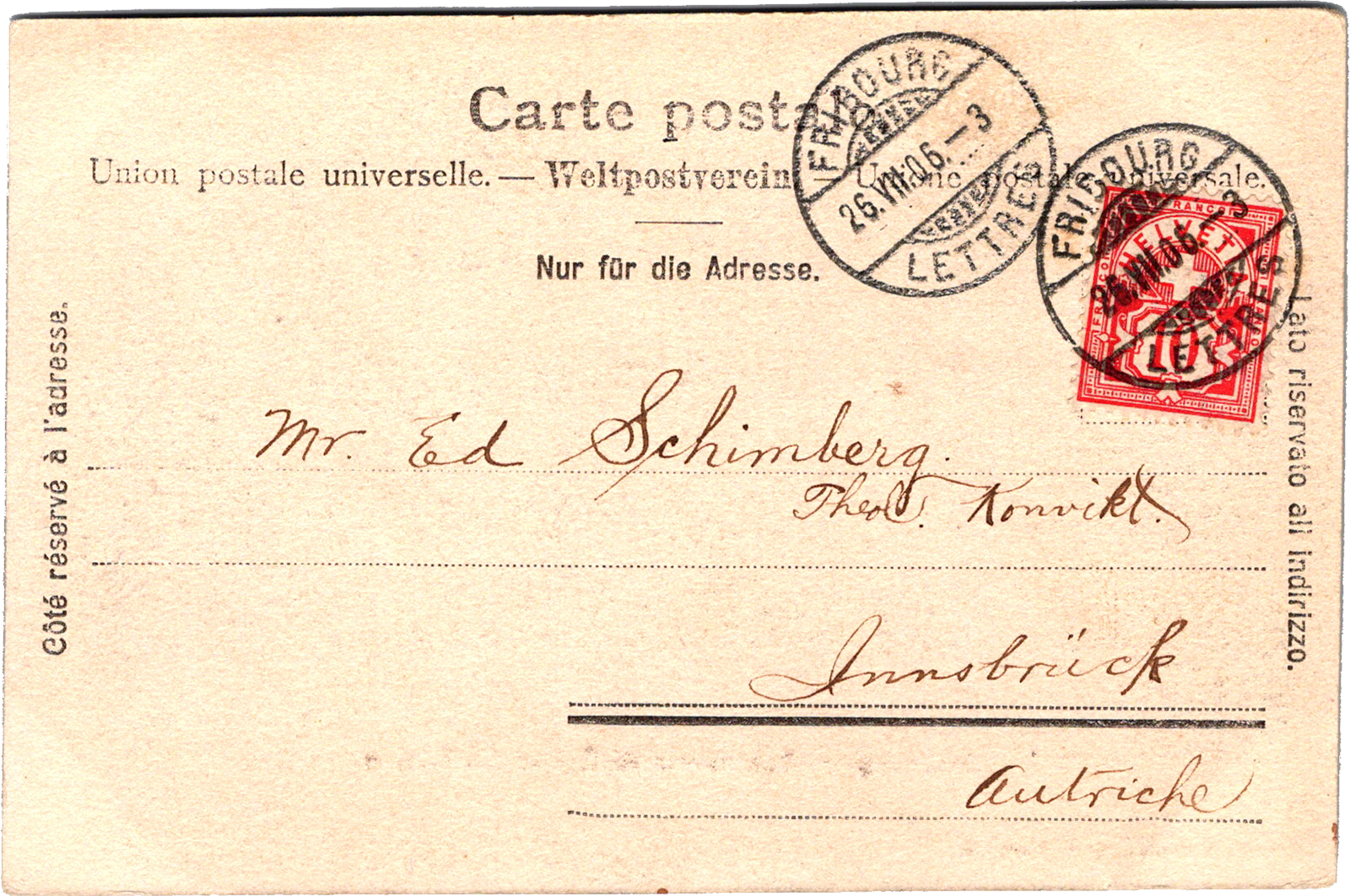 Cathédrale et Eglise St. Michel, Fribourg, Switzerland Fribourg – Cathédrale et Eglise St. Michel Postmarked: Jul 26 1906 From: John A. Nepper To: Edward Schimberg Referenced: Wolf Location: Fribourg, Fribourg, Switzerland Publisher: E. Chiffelle