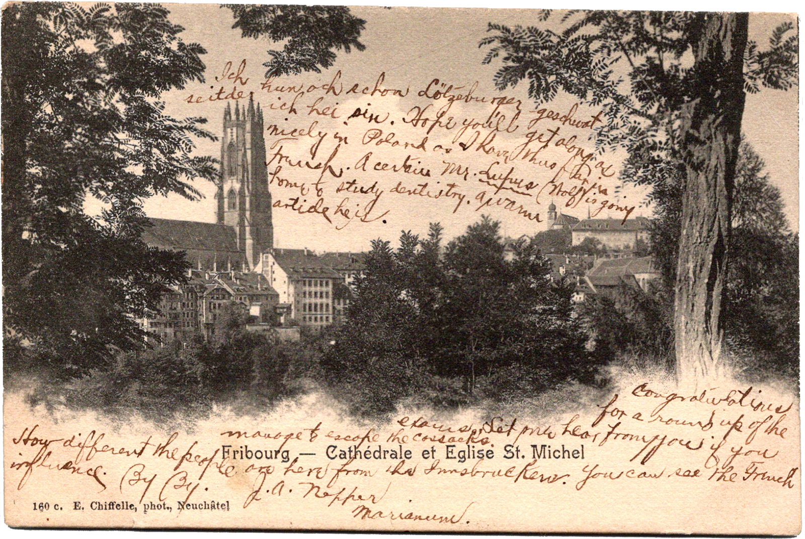 La Cathédrale et le Couvent des Cordeliers, Fribourg, Switzerland Fribourg. La Cathédrale et le Couvent des Cordeliers Dated: Sep 25 1906 From: Fr. E. Murphy, Gabriel Eilers, Gerry, Hubert M. Ostermann To: Edward Schimberg Referenced: Hurter, Minister, Wolf, Leo J. Logan, John A. Nepper, Gilly Location: Fribourg, Fribourg, Switzerland