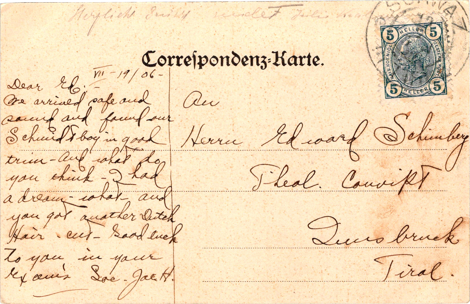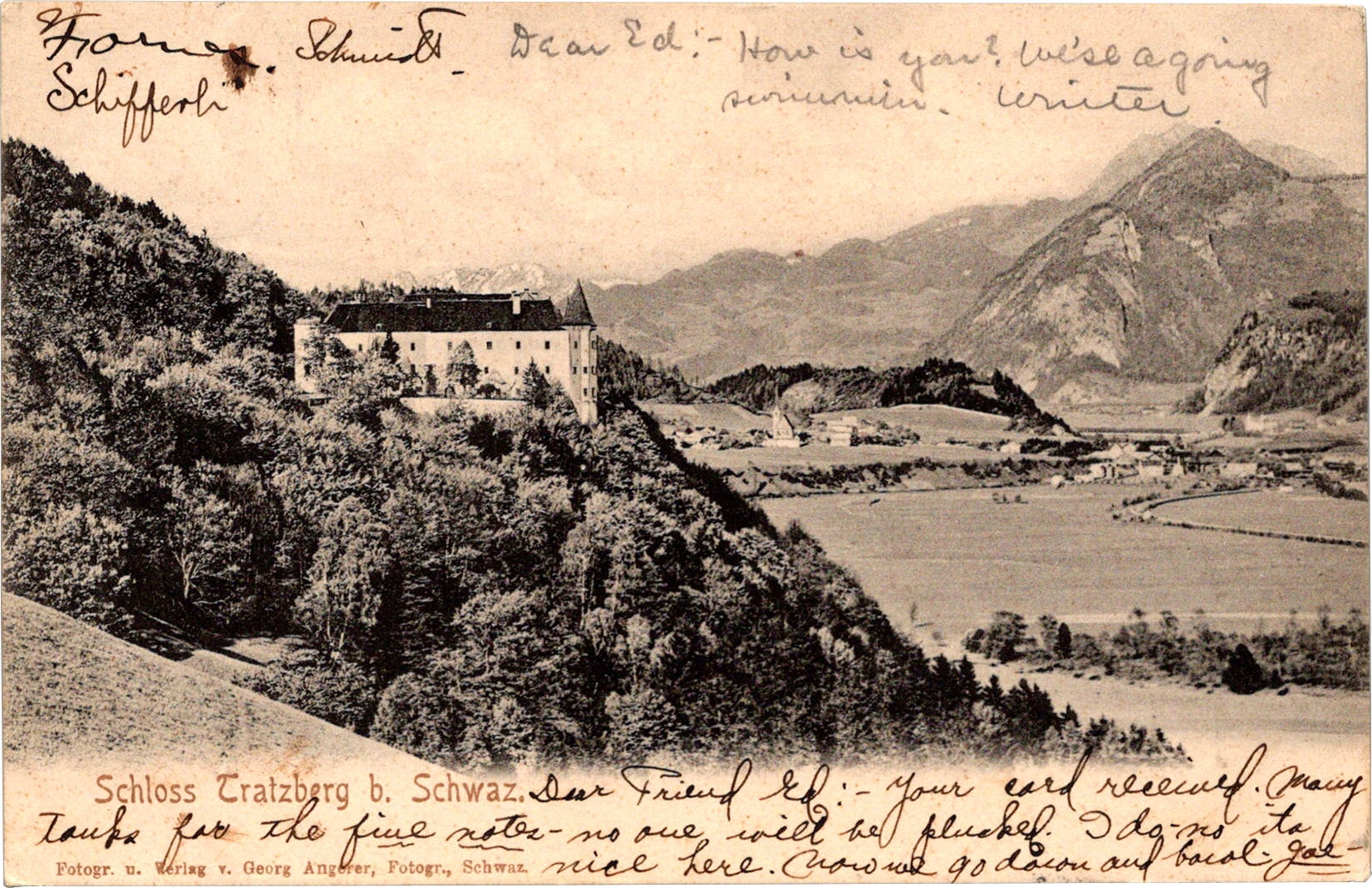 Schloss Tratzberg b. Schwaz, Austria Schloss Tratzberg b. Schwaz Dated: Aug 19 1906 From: Jules Keal, Joseph H. “Socie Joe” Hoernschemeyer, Walter F. Fornes, George Schmidt, William M. Schifferli, Ludwin E. Winter To: Edward Schimberg Location: Schwaz, Tyrol, Austria Publisher #: None