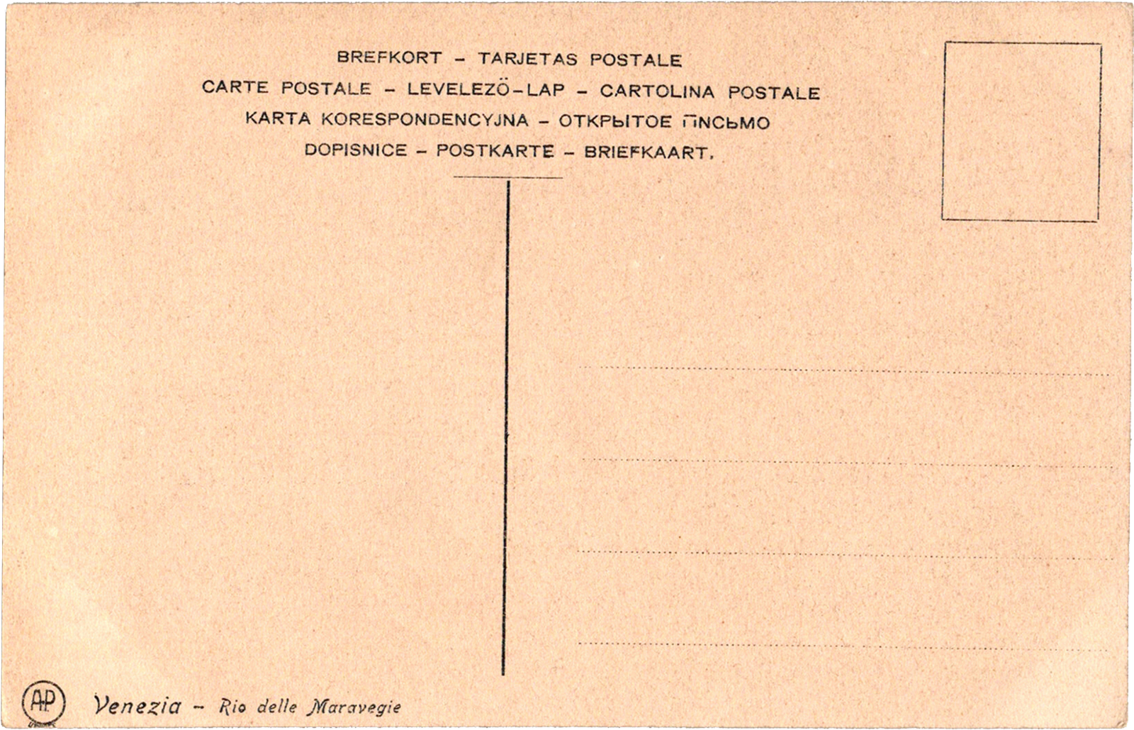 Rio delle Maravegie, Venezia, Italy Venezia – Rio delle Maravegie Estimated Date: Apr 1907 Location: Venice, Venezia, Italy Publisher #: None