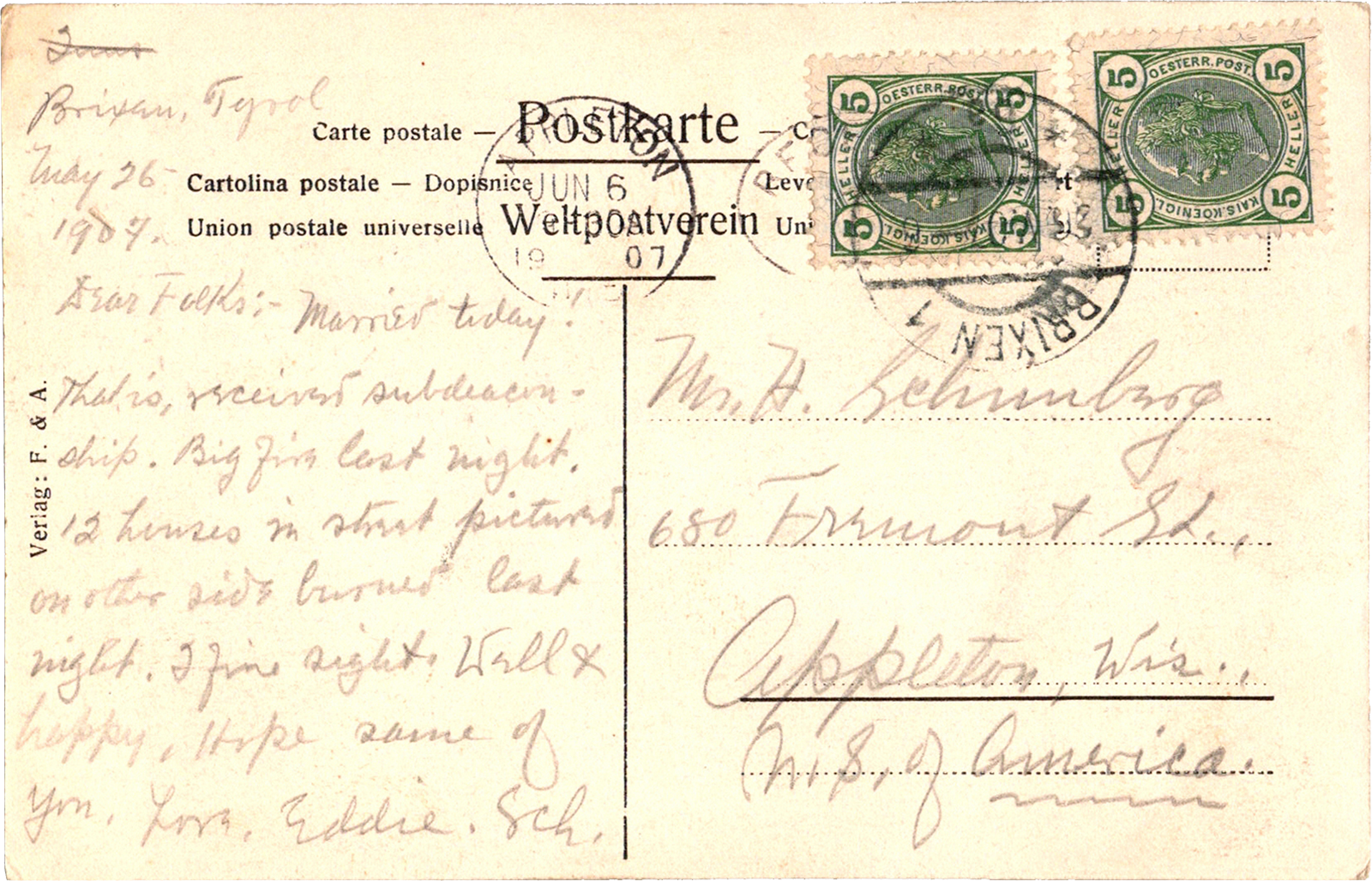 Stulfergasse, Brixen, Italy Brixen, Stulfergasse Dated: May 26 1907 From: Edward Schimberg To: Henry S. Schimberg, Josephine Frantz Schimberg Location: Brixen, Tyrol, Italy Publisher #: None