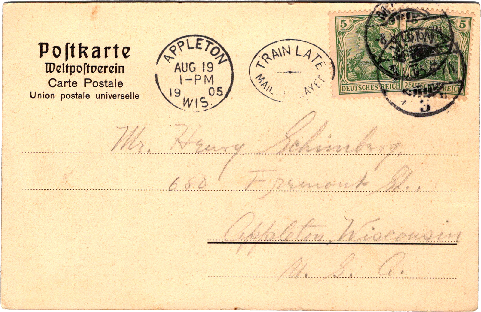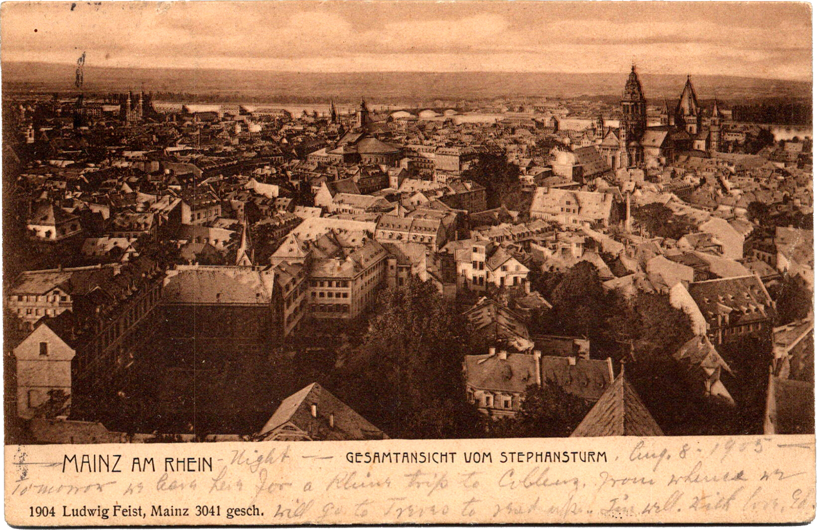 Gesamtansicht vom Stephansturm, Mainz am Rhein, Germany Mainz am Rhein: Gesamtansicht vom Stephansturm Dated: Aug 8 1905 From: Edward Schimberg To: Henry S. Schimberg Location: Mainz, Rhineland-Palatinate, Germany Publisher #: 3041