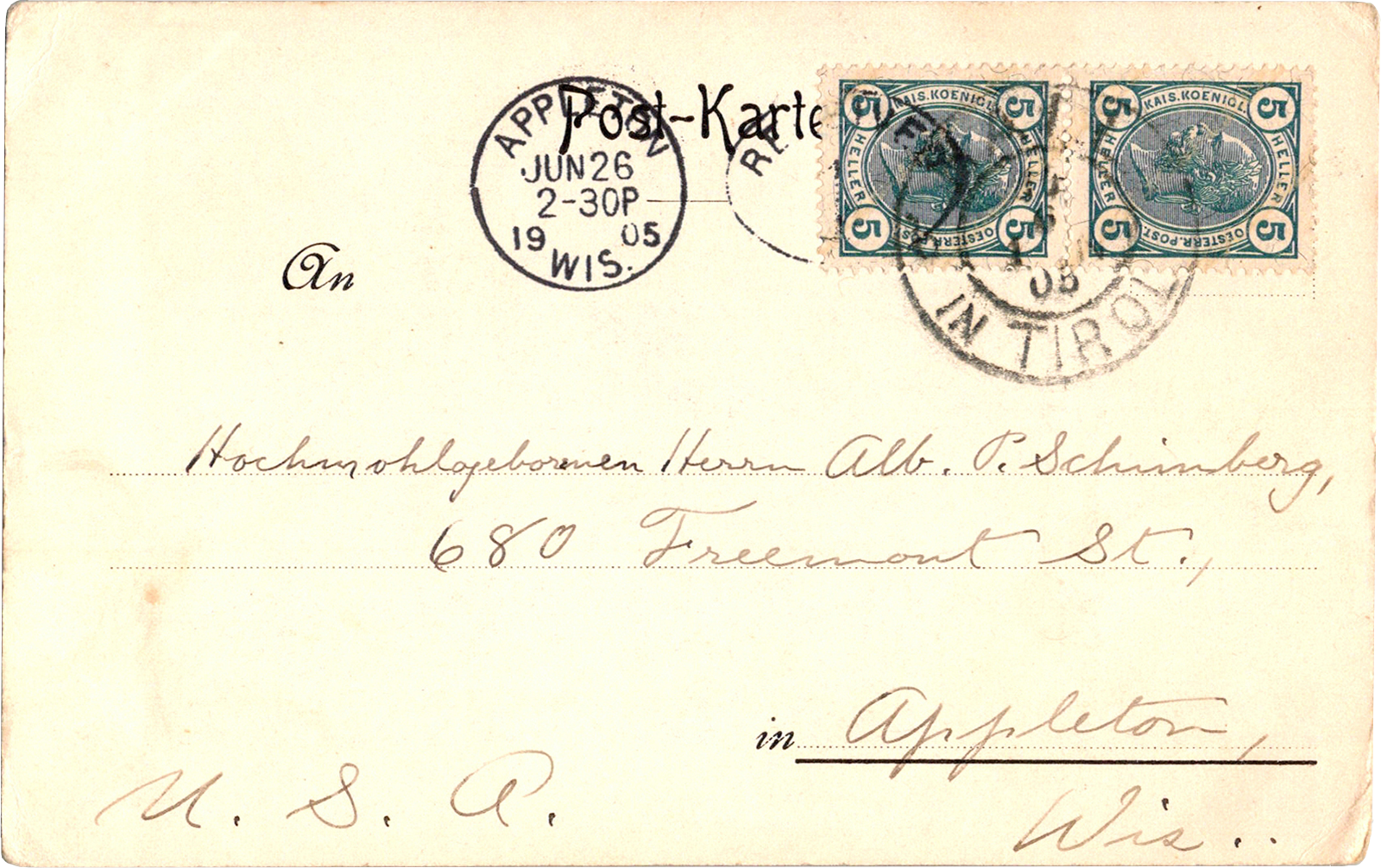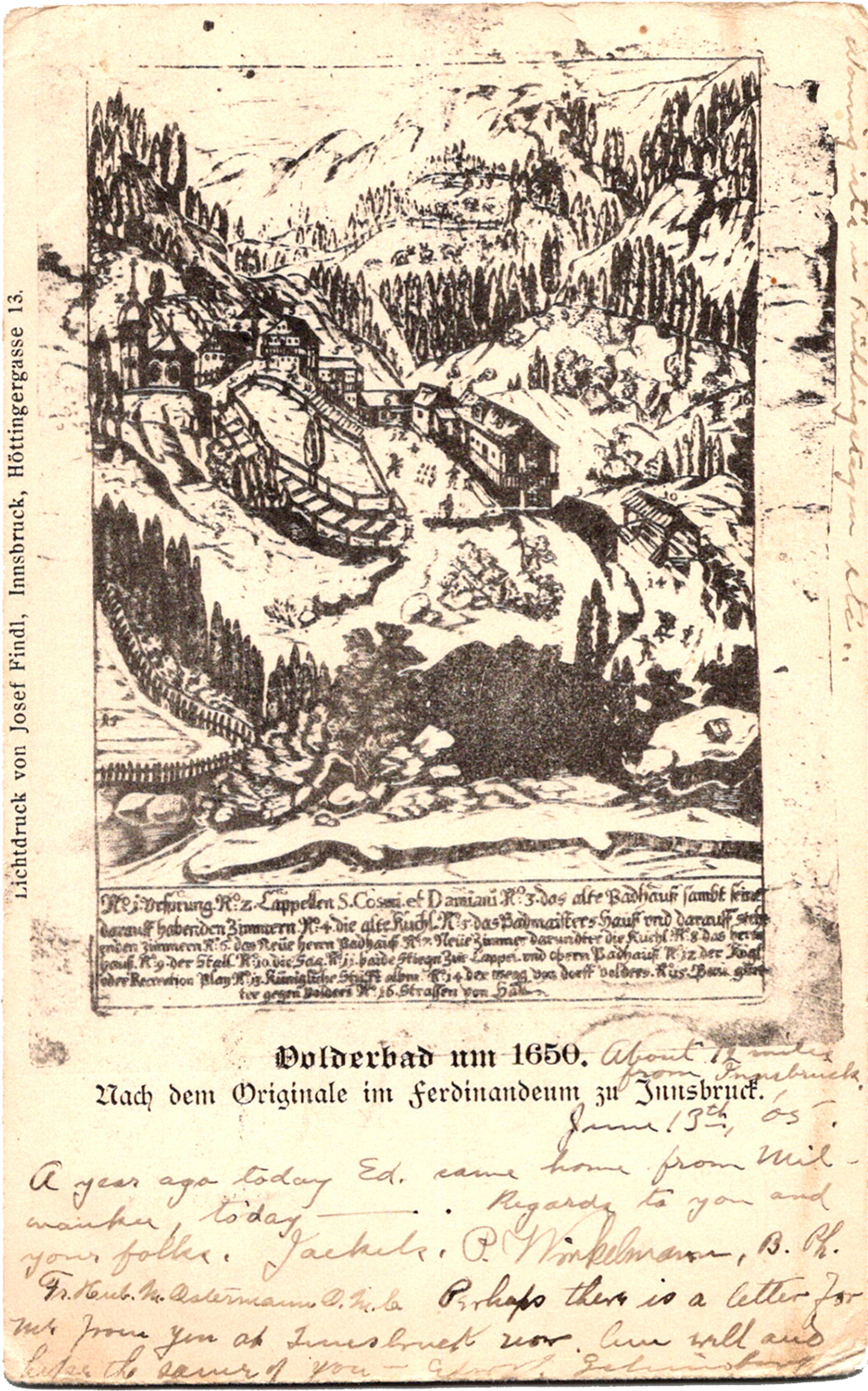 Volderbad um 1650, Nach dem Originale im Ferdinandeum zu Innsbruck, Austria Volderbad um 1650 Dated: Jun 13 1905 From: Edward Schimberg, Peter Winkelmann, Hubert M. Ostermann, Martin “D.D.” “Dee” Jaekels To: Albert P. Schimberg Location: Volderbad, Tyrol, Austria Publisher #: None