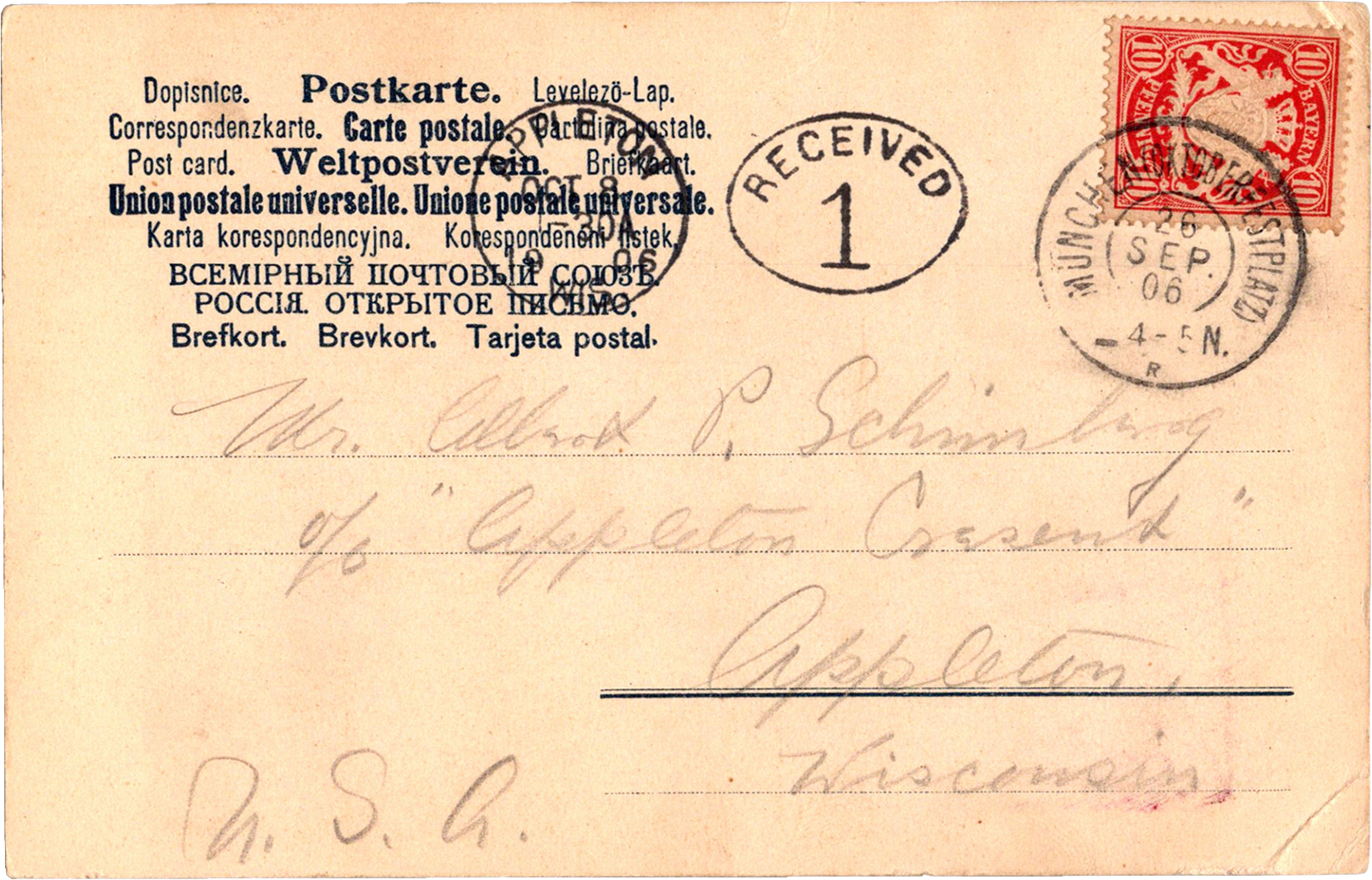 Cimbria, München, Germany Cimbria – München Dated: Sep 26 1906 From: Edward Schimberg To: Albert P. Schimberg Location: Munich, Bavaria, Germany Publisher #: None