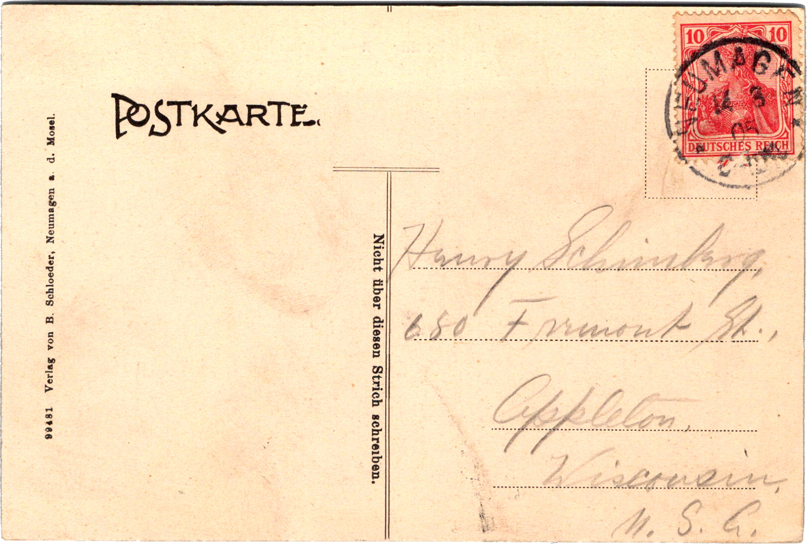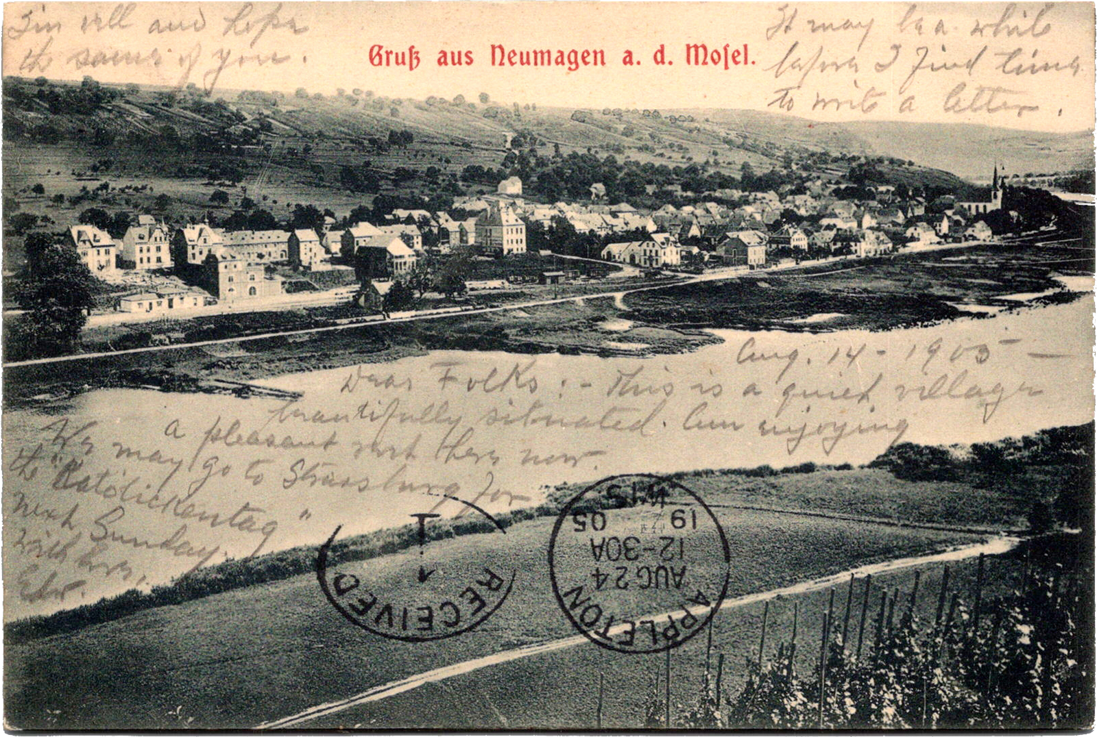 Gruß aus Neumagen a. d. Mosel, Germany Gruß aus Neumagen a. d. Mosel Dated: Aug 14 1905 From: Edward Schimberg To: Henry S. Schimberg, Josephine Frantz Schimberg Location: Neumagen-Dhron, Rhineland-Palatinate, Germany Publisher #: 99481