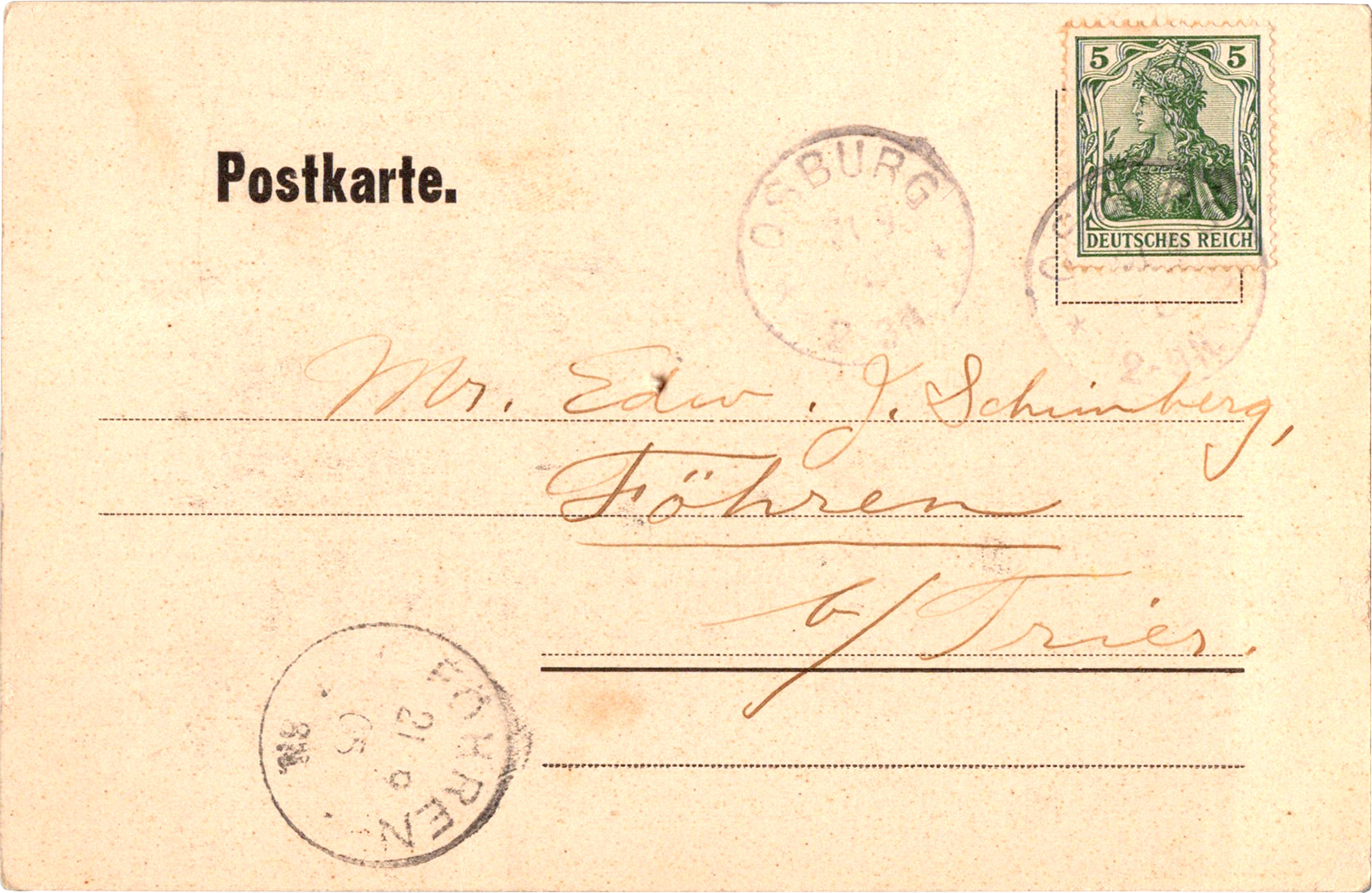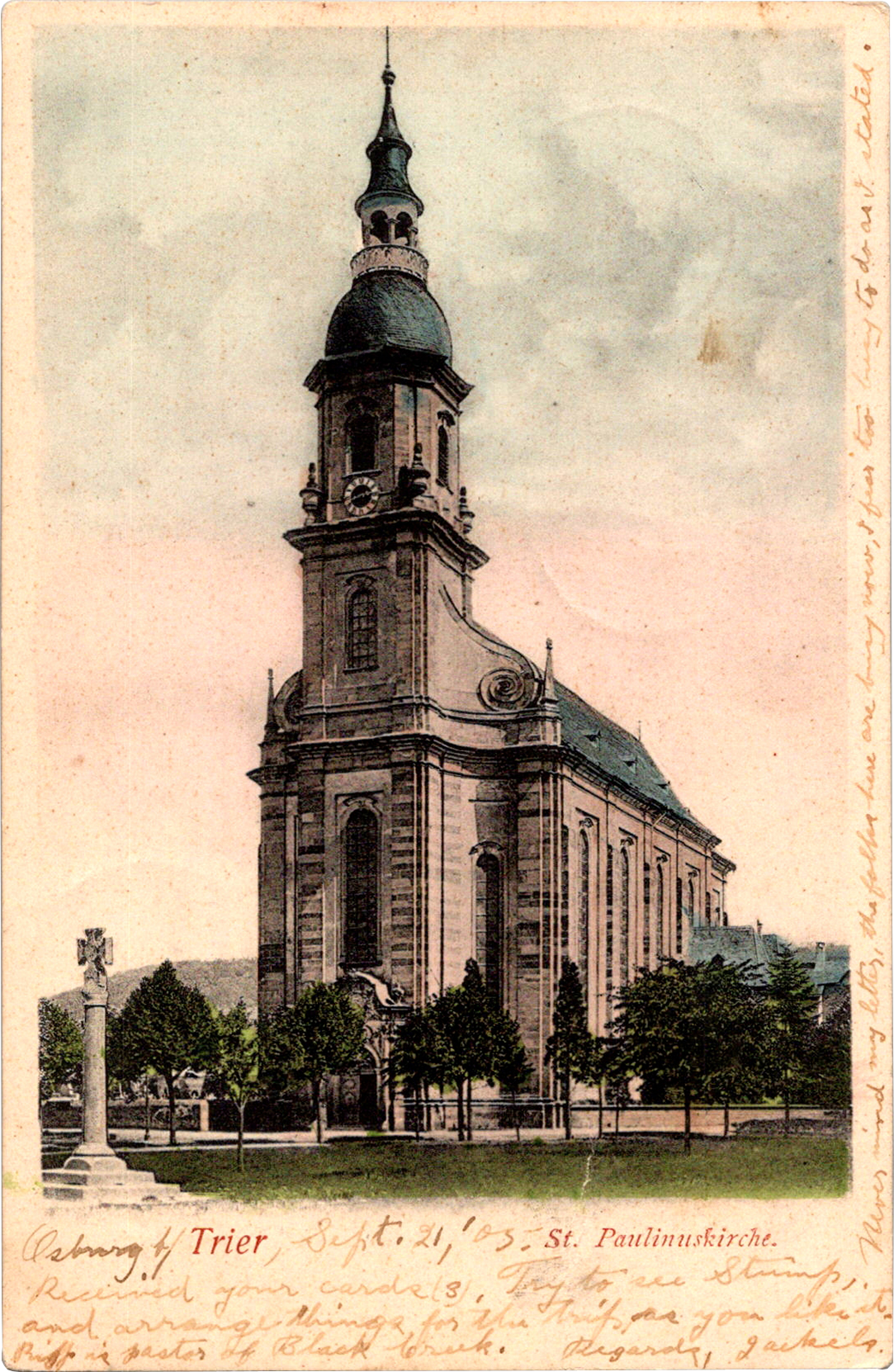 Osburg b/Trier, Sept. 21, '05. Received your cards (3). Try to see Stump, and arrange things for the trip as you like it. Riff[?] is pastor of Black Creek. Regards, Jaekels