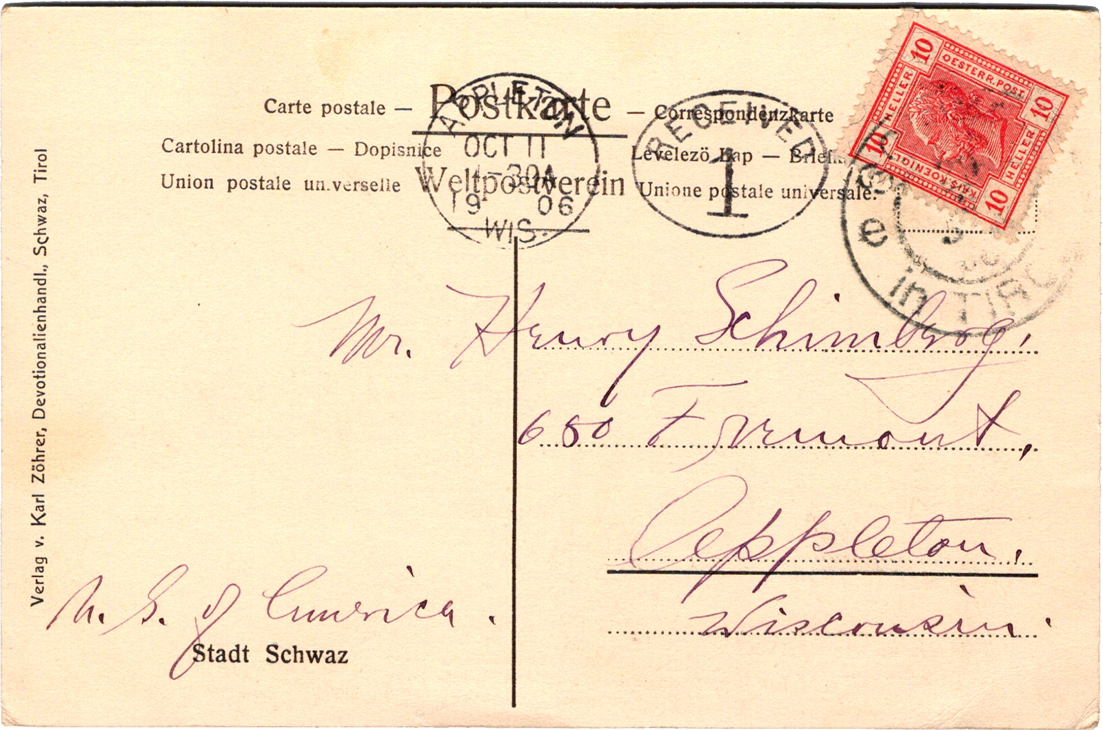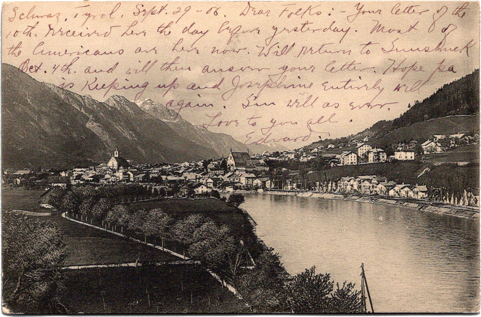 Schwaz, Tyrol. Sept. 29 - 06. Dear Folks: - Your letter of the 10th. received here the day before yesterday. Most of the Americans are here now. Will return to Innsbruck Oct. 4th. and will then answer your letter. Hope pa is keeping up and Josephine entirely well again. I'm well as ever. Love to you all.